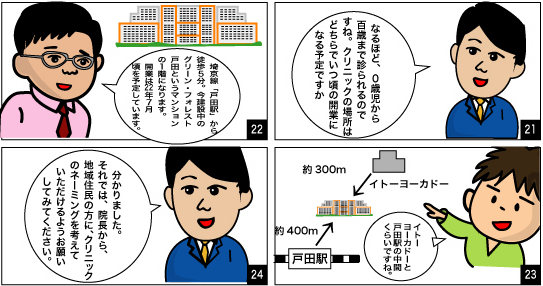 森の診療所:マンション名+小児科もあるということで、親しみやすく、子供が通いやすいように大きなくまのぬいぐるみとかがあってアットホームな病院になるといいなと思います。
