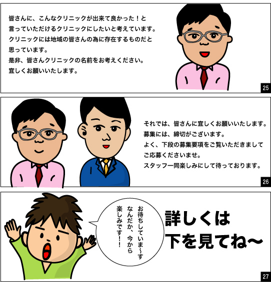 応募者皆様のクリニックに対する思いはさまざまですが、たとえば、こどもが安心して通える、家族そろって行ける、笑顔で迎えてくれ自分も笑顔で帰れる、地域で一番を目指してほしい、 共生の理念を生かしてほしい、など僕たちの目指すべき道が示されたような気がします。